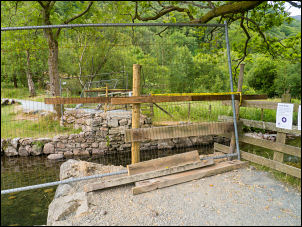 | I wasn’t too bothered as the river would have been easy to wade. Nearer the lake there were several stepping stones so it was easy to cross. I was following the south shore path and that had a short length closed with a barrier that was easy to walk round. I wandered along the path with overcast views until I reached the southern end of the lake where I turned off the main path to head up the fellside on the Scarth Gap Pass path. It was a steady climb on a good path and higher up were bags of rocks ready for path improvements. |