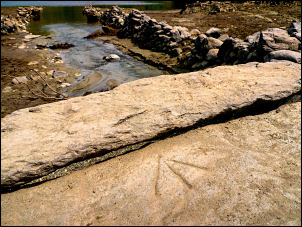 | I was very glad to reach the path just above the shore of Haweswater. I continued towards Bowderthwaite Bridge where I climbed the fence to walk out across the old fields which are now mudflats to visit Fieldhead Bridge which is now exposed by the low water level. I have visited it during a previous drought. |
