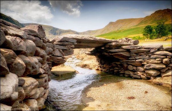 | It is a bridge of large flat stones with a large Ordnance Survey bench mark carved on the top. I managed to get some interesting photos with it in the foreground and Riggindale in the background. I headed back on to dry ground to reach a stile that took me back onto the main path. Here I met two men who were also walking back and we chatted as we walked. They were just up for the day and had come from Preston. |