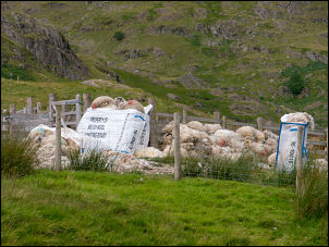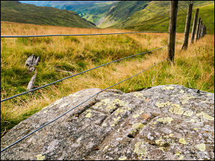 | I set off up Gatescarth Pass which used to be a road access to the valley but now can only be negotiated with quad bikes or Land Rovers. A short way up across the field to the right was a large area of sheep fleeces which were piled quite high. I continued up the valley and it was a steady climb but soon the rain started. I stopped at the first gate and put my waterproofs on but within a short time the rain stopped. I decided to keep them on just in case. | |