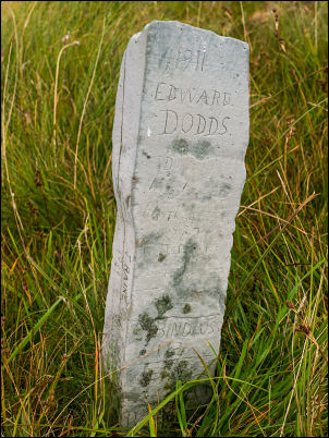 | There is another pillar to the south which is in line with this one and the Water Tower. Passing a small tarn I headed up to the unnamed minor summit with about three or four stones marking it stop. I continued east and left the path to search out the old marker stone which I last visited 10 years ago. The stone reads “1911 Edward Dodds” and is surprisingly small but thankfully is still in place. |