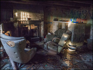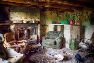 | Inside it was dry as the roof was still intact and it looks as though someone had been using it as old chairs were circled around the fire and one had a pile of empty beer cans underneath. Up the stairs in a room to the left was an exercise frame which still had some weights on one end. It was more or less as I’d seen it 5 years ago. I left on continued so to follow the path along a very wet farm access track which became extremely narrow as it climbed up towards the road. |