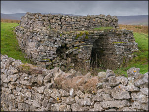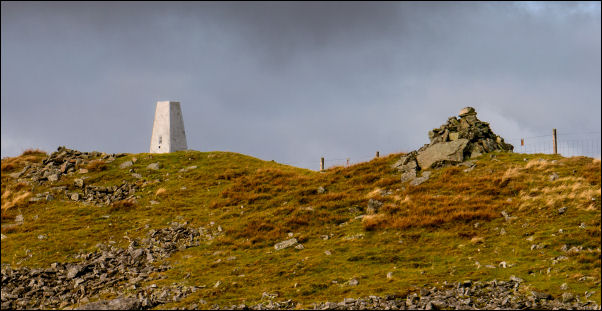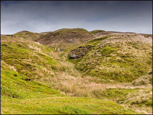 | I left the track to head across the rough moor to a large cairn and the High Fell trig post. There were the remains of some mining buildings so I stopped to have my butties in the shelter of a low wall. I descended across the moor to re-join the track walking through an area of disused mine's and old bell shafts. At the track I descended down towards the B6277 which I could see clearly below. |