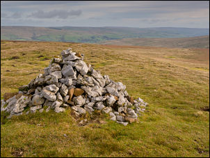 | I continued up the road to a gate where the tarmac finished and I was on a rough stone track heading up the hill. I had a look at a small cairn which gave commanding views to the west and south down the dale. The whole area was covered in mining spoil heaps. |