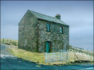 | There is no footpath but fortunately the traffic was light. Just before my planned turn off onto a minor trike I stopped to look at an old stone milepost. A little further on is an interesting stone building which seems to serve no purpose other than storage or for shooting parties. Opposite is a narrow track which was the route I was taking. |
