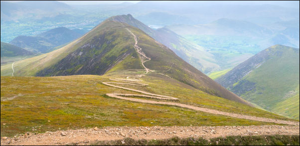 | At the bottom I crossed a stream and then had to negotiate an open area with no path of any kind. Fortunately the ground wasn't too steep and it was easy going. Eventually I joined one of the paths coming up from Force Crag mine area and was then on a well use path over Oughterside Summit. I could see the path ahead as I continued towards Stile End. There was a steep descent but I didn’t continue on my planned route but turned to the right to a minor path which joined up with the main Stonycroft Ghyll path coming up from Stair. I met a man who was sitting waiting for a friend as he had his lunch. I stopped and chatted for a while then continued down as many others were walking up. The path was quite substantial and was probably originally here for the Miners. It continued round the base of the hill to bring me back to the road where I’d left my car. | |