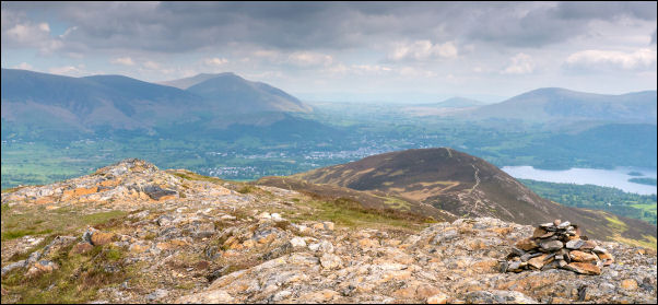| I stopped here to have my sandwiches before continuing up another steep rocky scramble to Crag Hill summit and the trig post. On the top there was high cloud but I still had excellent views all around. My plan was to follow the clifftop to the north but the map shows no path. The official route is to the west. I headed along my planned route which was easy and pleasant walking. As I continued a fell runner came up the other way. On the descent down to Coledale Hause the faint path becomes steeper but down to my rights was a grassy descent above Ell Crag. I'd noticed this on aerial photos earlier and it looked like an easy descent down the grassy hillside. |
