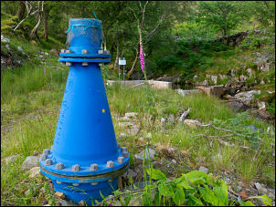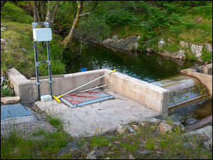 56.693135, -04.190658 OS Grid ref: NN 65937 57856 Drove to the small parking area on the east shore of Loch Rannoch and set off walking along the road on the west side of the Loch. I soon reached a gate on the left which is where I left the road to follow the track up between the trees and by the burn. The map shown the track ending up ahead and I wondered what it could be for. As I approached the end I saw a vertical flanged pipe ticking out of the ground and just behind it a concreted dam and weir in the river. |
