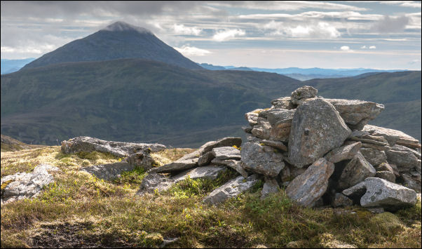 | The weather was fine and I had good views of Loch Rannock as I continued up and over a couple of false summits. The highest point on my walk is Meall Breac (Speckled Hill) and I thought I could see it up ahead with a cairn on top. I headed for a ridge ahead and when I reached it had a nice view of Schiehalion. The ridge was flat and boggy in places but as I arrived at what I though was the summit I saw the actual summit some way ahead. |