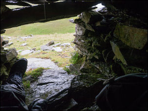| Fortunately I found an old shepherd’s stone shelter as the heavy rain got even worse. I was able to climb inside and escape the main deluge. However rivulets continued to dribble down through the stone roof slabs I continued in less wet weather by Little Castle How and noticed a lone figure on the top. My path was lower so didn't get the chance to say hello. The view ahead was impressive but Pike of Blisco was lost in cloud as were the rest of the high fells. |