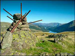 | The summit isn't really a summit in the conventional sense. More like a few hummocks and plateau stretching to the west. It's an interesting place to stop for a brew though as it has an 'artistic' summit cairn with protruding fence posts and, if the weather is clear, views of Thirlmere and Blencathra to the north. | |