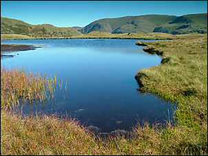 | My plan had been to wander over to the west and return via Gibson Knott and Helm Crag. But the weather was so nice and the walking conditions so good it would have been a waste not to take full advantage. So a rethink was needed and a new route decided on. Over Grasmere Common and down by Codale Tarn seemed a good and longer alternative. Approaching Calf Crag I came across the first of two tarns, neither of which was named on my map. I would have thought both justified a name as I have seen some named tarn that only just qualify for puddle status (eg. Foxes tarn on Sca Fell!) | |