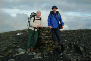 | I stopped briefly with Eric to pose for a group of two photo by the direction marker before continuing north and starting the descent. Just before Bakestall there is an old ruined bield, which we used for our lunch stop. There was still no wind so sitting there was quite pleasant as we discussed the contents of our sandwiches. We reached the Skiddaw House access track at Whitewater Dash waterfalls. Some recent stoning and drainage works had been done on the upper part of the track but as we descended it reverted to the original surface which lower down is still quite good. The rest of the way back to the road was easy and very pleasant walking. |