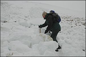 | A light dusting of snow covered the ground and some cornices had formed on the western rim of the corrie surrounding Bowscale Tarn. We battled on south towards Bannerdale Crags and took the lower trail towards Mungrisdale Common and the head of the valley above the River Glenderamackin. Two trails descend the valley but we took the southerly one to try and maintain some height. Quite a bit of snow lay on the ground and at one point we had to cross some avalanche debris. | |
