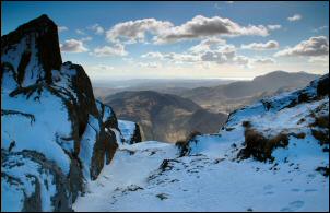 I continued along the high level path into the Langdales. The sky remained clear and all the fells were covered in snow, though it didn’t feel particularly cold. As Stickle Tarn appeared ahead I could see the diagonal line of Jack’s Rake running up Pavey Ark. I’d sort of hoped I could climb up this scramble for the first time in about 30 years but as I got nearer I saw that the groove was choked with snow and ice. I had crampons and ice axe with me but didn’t fancy risking it. To the right of the Pavey Ark rock face was a much more pedestrian climb up a ridge. It was still quite steep and icy in places but not too difficult. At the summit I had great views across the Langdales. I would have like to have lingered longer but was conscious of having to get back to Grasmere for an afternoon lecture in the Tithe Barn at 14:30. |