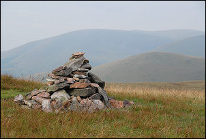 Murthwaite is a working farm but when I passed there was nobody about. I headed north towards Harter Fell but the track soon became indistinct, then improved again as another farm track joined it from the right. I didn’t stay with the official track for long as I cut up to the right to follow an old green track diagonally up the side of Harter Fell. After a while I left this and took a steep direct route up the west side. Once the gradient had eased I was able to wander easily towards the summit cairn in the distance. Looking back I could clearly see the farmstead of Adamthwaite, which Wainwright’s Howgill Fells book describes as attractive. Maybe it was when he saw it but now it has a look of neglect with many new outbuildings which weren’t there when Wainwright made the sketch for his book. Near the Harter Fell cairn was the remains of a large bonfire and judging by the rusting hoops of wire it was originally made from tyres. |