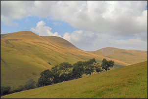 I arrived at the small car park adjacent to Rawthey Bridge on the A683 Sedbergh – Kirkby Stephen road about 7:15am. Shortly after arriving I watched the 564 bus pass on its way to Kendal. It was no surprise to see that it was empty of passengers. The last time I used the service there was only me and one other person on it. I followed the path through dew sodden fields on the north side of the river and then turned NE up through the woods to Murthwaite. As I left the trees a deer bounded across the field. The views back down the Rawthey valley were quite picturesque but the distant haze prevented really nice views. |