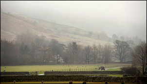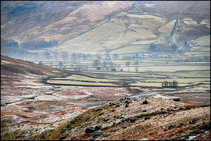 I’d just started walking again when a party of walkers approached me through the mist. Shortly after that another group, but much larger, approached. I didn’t have any problems finding the way now. I reached the saddle at Three Tarns and started down the stone stepped path. Unfortunately all the boots had compacted the snow on the steps, making the descent slippery. I put my mini-crampons on for a while until I was clear of the snow. I was in cloud all the way down ‘The Band’ and even when I reached Stool End Farm it was still quite misty. It was a pleasant walk along the farm access road and back to the car. |