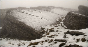 All I could do was head on a compass bearing and stick it out. I then decided to cut my walk short at Ore Gap and take the escape route back down to Angle Tarn. It took ages but eventually the ground seemed to slope down in the right direction as I approached the saddle at Ore Gap. To my surprise I saw some fresh footprints coming down from the Bow Fell route. I decided to return to my original plan as I now had somebody else’s route finding to follow. Soon another set of footprints joined the first and I had a fairly easy trail to follow. Approaching Bow Fell I found some shelter behind a rock and stopped for lunch. The walk over Esk Pike had taken longer than expected due to all the mini detours to get round snow covered boulders. |