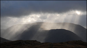 I left it part way up to make the direct climb to the summit, where there wasn’t a cairn, and down again to the sheepfold at Low Moss. I was glad to reach it as it was the only place where I could get some shelter from the wind. I decided to stay a while and have my sandwiches and coffee. The map shows the path splitting so I took the left branch as I hoped it might have better shelter from the wind. When I got to the summit trig point on Place Fell I had a lot of difficulty getting to the top because of the wind. I must have looked very strange as I clung to the column with both arms wrapped round it. A short blast of rain hit then some clear patches allowed a few shafts of sunshine through, though they were very brief. In the distance I had some dramatic views of Brothers Water and Kirkstone Pass. |
