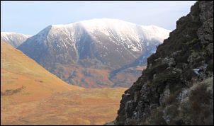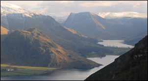 There wasn’t much wind on the tops but it was quite cold and not pleasant to hang around in. The descent to Scall Force (waterfall) was quite tricky as the steep path was covered in ice, so I had to take a parallel route through the heather. At the waterfall I took a minor path across Black Beck and up the south end of Mellbreak. It is an easy and firm route up the mountain and there are wonderful views. I bit of thin high cloud was now blowing in and it seemed to get a bit colder. Several sections of the path were coated in ice so again I had to wade through the heather. The descent at the northern end of the mountain is quite steep but it is worth it as part way down is a flat shelf with a short path round to the right. This gives a wonderful view across the steep eastern slope of Mellbreak and down to Crummock Water, Buttermere and on to Fleetwith Pike in the distance. At the bottom of the scree the path runs through a clearing in the pine trees to join the main track back to Loweswater. |