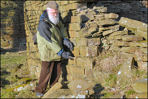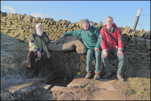 We had a look round then continued on but went a bit too far and had to retrace our steps to find the right path for Rushy Leach. We passed the ruin and followed the old track round to the ruin of Musden Head. Here Jack showed us what looked like an underground storage area. The track carried on round the head of the valley and on towards Tor Hill. We realised that we wouldn’t have time to walk to it so once again retraced our steps and headed up the pathless Burnt Hill. After crossing an old wall and fence line we came to a path that followed the head of Musbury Brook and on to a more substantial track. The old map shows a point called Robin Hood’s Well and I wanted to see what was there. Jack had been in the area before and was told by a woman he met that it wasn’t worth looking at, so he didn’t. I wanted to check so we all descended to the gate where the map shows it. Eric spotted the spring in the base of the wall. It had been recently tidied up at the base but the main part was an old stone trough with a large capping stone. Further down the lane a lot of reconstruction work was being done by machine. A local man was there and said he remembered being brought up to the well as a small boy by his mother. |