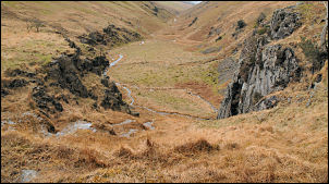 Burnmoor Lodge above the southern shore of the tarn looked very isolated and forlorn. Nobody else was to see anywhere. Eventually I came across a path but it was too high so I continued down to the wide, flat and boggy area before the start of the valley. I soon reached the head of the valley and was surprised to see a valley head surrounded by vertical cliffs, though not too high, and a series of waterfalls tumbling down to start the river. |