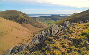 Eventually the summit of Black Combe appeared in the distance but I decided to find a sheltered spot along the ridge of Blackcombe Screes first. The idea was to sit down and enjoy a leisurely lunch with wonderful views. I found the ideal spot with shelter from the cold breeze and something of a sun trap. |