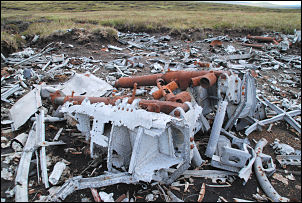 This is where I turned left to follow the wire fence down to the east. Where the fence takes a turn to the SE I decided to strike out across the moor towards Angram reservoir. I hadn’t left he fence far behind when I came to some aircraft wreckage. It was mostly concentrated in a small area and what looked like large pieces of undercarriage were surrounded my many pieces of aluminium which had been in a fire and melted. The site was quite old and was known about as a small wooden cross had been placed by the wreckage, along with a small plastic poppy. |