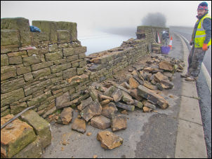 man was rebuilding a gap made where a vehicle hit the wall. It's