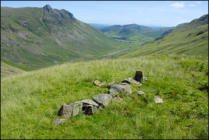 The track was just as horrible as ever with its loose pebbles which are very uncomfortable to walk on. It was nice to see families out walking and young children playing by the river. I crossed Stake Gill and then headed up Rossett Gill. I wanted to look for the Packwoman’s grave and also walk along the path over the summit of Rossett Pike. When the main path begins to get steep and the rebuilt stretches take an easier line up the gill I left it to head directly up the gill side. I was following the line of the old track but there was no sign of it. I reached the path maker’s hut with still no sign of the grave. This was the area I’d searched last week and now I had a photo I realised I was in the wrong place. I continued higher and at last recognised the background profile in the photo and some of the boulders. I climbed higher and reached a shelf to suddenly see the large stones in the form of a cross. It is a very secluded spot with a magnificent view. It can’t be seen from the path and would probably only be stumbled on it if you were lost. |