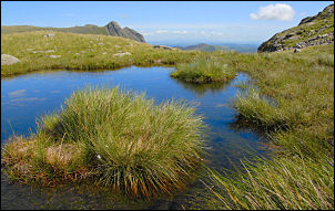 A small tarn is shown on the map and I spent a bit of time there looking across to Pike of Stickle. I didn’t want to follow the main boggy path to the summit of Stake Pass so decided to take the shorter minor path down to Stake Gill. It’s shown on the map but is indistinct on the ground. I was above Black Crags and realised I was too high. I saw a faint trail below and made the steep descent to it. I picked a way down but apparently I wasn’t on the route shown on the map. I did meet the main Stake Pass descent path though and had an easy walk down to the bottom. There were still plenty of people about and the warm sunshine continued. I followed the track back to the Old Dungeon Ghyll and back up the road to the car. |