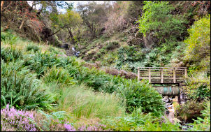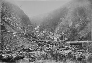 I reached the Hornby Road, which is a track on the line of the Roman Road. I turned right but didn’t get the advantage of its easy going for long. I was heading down Whitendale and the path shown on the map seemed a bit vague. Fortunately there was a marker post showing where it started and other smaller posts marking its route through he rough moor. I reached the valley bottom and eventually a better path emerged. The valley opened out into fields then a farm track appeared which I followed to the Whitendale Farm buildings. The farm road ran down the west side of the river but I wanted to follow the path along the opposite side. I asked a man where it was and was told there was a ‘closed path’ sign but it was still possible to get through. The first part was quite wet but it got better. I’d brought some paper prints of old water works intake photos from the 1880s with me and one was supposed to be in Costy Clough. When I reached the clough there it was. The same view from 130 years ago. |