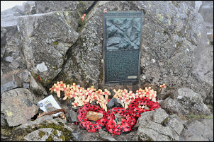 The ground levels just below the summit and as I arrived a couple of walkers were just leaving and one was still there. I wandered around to see if there were any suitable places to put a tent at some future occasion but there was nothing obvious. Everywhere was rock and stones with no grassy areas. When the lone walker had gone I had the place to myself and had a look at the memorial attached to the summit rock. I then started my descent towards Sty Head. The first part of the path heads down in a SE direction and was well marked and easy to follow. There were still no views, which is a pity. I hadn’t descended far before some flat areas with enough grass on them to pitch a tent appeared. Unfortunately there was no water nearby. I had to descent almost to Sty head before a suitable spring appeared by the path. |