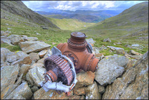 This got me high above the valley and provided a good view point for the northern face of Wetherlam. I wanted to have a good look at it through the binoculars as a disused mine working is shown on the map above Long Crag level. I’d tried to find it last weekend but couldn’t. I could see what looked like the entrance in a cleft so its verification will have to wait for another time. I left the main ridge and followed the contour along to the left to join the top end of Greenburn Beck and the steep sided amphitheatre at the head of the valley. This is the area where the main parts of the Halifax wreckage rests. I soon came to the Rolls Royce Merlin engine lying in the beck. |