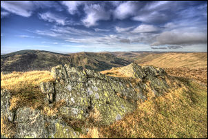 Today was different as the panorama was excellent. It was good underfoot and a delight to walk along and over Winterscleugh, Belt Howe and Casterfell Hill towards Jeffrey’s Mount. I left the main path and climbed Jeffrey’s Mount from the steeper SW side. I wandered around the flat summit for a while to see if there was any water for a future camp but I could only find a drainage ditch which wasn’t much good. |