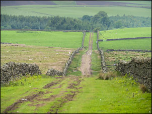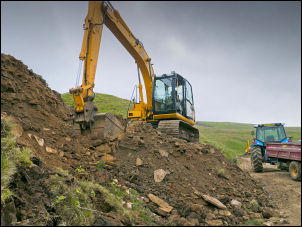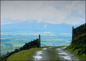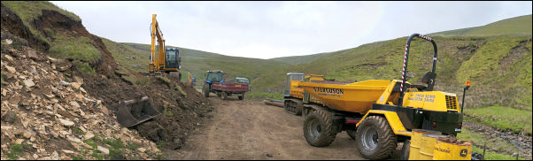 I was just below the cloud when I arrived and had excellent views to the Cumbrian fells. Ahead I could see the large cairn on Watch Hill, just over a mile away. The path was indistinct in places but fairly good to follow. The cloud was quite changeable and Thack Moor summit vanished behind me. The cairn was partly collapsed and must have been considerably higher when first built. The path continued to Watch Hill where a wooden stile and small gate crossed the wall. I didn’t use it as I was descending to Croglin Water. About half way down I found a sheltered depression by the wall so I took the opportunity to have my lunch out of the wind. As I approached the valley bottom I saw machines and road construction going on in the distance. The work was quite substantial and I puzzled why such a high quality road was being put in through such a remote area. As I approached one of the workmen walked towards me and wondered why I was taking pictures. |