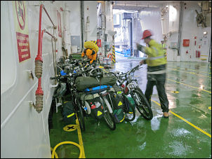 our bikes down the ramp into the car bay area and lashed them to the