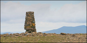 Higher up it is necessary to find a small path which traverses to the left and then up a steep narrow gully to reach the westernmost edge of the Grasmoor summit area. The early morning sunshine had now gone and a chilly wind was blowing as I walked from the first of a series of cairns to the summit shelter stones. The cloud had also rolled in but it wasn’t low so I still had good distant views of the Solway Firth and Scottish coast. |