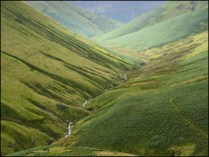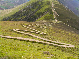 It is probably repairable but if left too long the whole pillar will collapse. There then followed a steep descent down the rocky ridge to Sail. It was bad enough on foot but as I climbed down there was a group of mountain bikers carrying their bikes up the ridge. Down from Sail is a recently made zig zag path down to the saddle where the path continues to Causey Pike. I took the sharp right path which follows down to Addacomb Beck. |