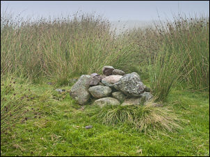 I crossed an old bridleway then to a boundary wall where I got a fleeting view of the Sellafield Nuclear Plant by the sea, but it was soon lost in the mist. A fence line took me to Stone Pike and a large circular stone sheepfold. It struck me as a very exposed place to build such a thing. I headed north across boggy ground to Swainson Knott. There was now a bit of a view and I could see some distant fells. |