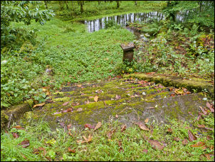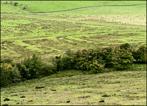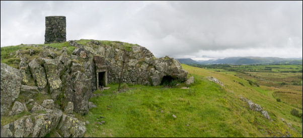 As I got nearer to the A591 road I saw the chimney and then the hearth with the interesting iron pole in front. Various comments on the web mentioned it possibly being all that remains of a house but I reckon it had something to do with a nearby small quarry and may have been used for an industrial process. The hearth didn’t connect directly with the chimney but had a large flue, indicating something other than domestic use. In front of me I had a good view of the Caermote Roman Fort which stood out distinctly on the landscape. |