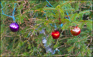 Sure enough the grassy route up was there and I followed it up to the summit ridge just below Grisedale Pike. The clear weather had been forecast and was just beginning to arrive. Some sun started to reach the surrounding fells, but none where I was. There were plenty of people about now and Grisedale Pike summit had about a dozen people wandering around. I didn’t stop but headed down to the north while several people approached form Sleet How to the east. Just below the summit there is a choice of descent routes. Ridges to the NW and NE were before me. I’d been to the NE before but not NW to Hobcarton End. So that’s the route I took. There was no discernible track for the first part of the descent but as the ground levelled out a distinct path appeared and followed along the ridge passing a couple of small cairns on the way. On Hobcarton End I noticed a lone pine tree a short way to the west. It seemed so out of place and as I took a closer look I noticed it had been festooned with Christmas decorations. Many of the glass globes had been blown off and were strewn around on the ground. |