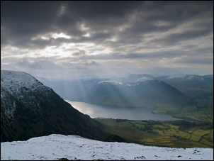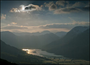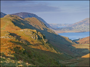That was the ridge I walked along, meeting several walkers on the way. Rays of sunshine broke through briefly to illuminate Crummock Water as I caught sight of it between Whiteside and Grasmoor. The first part of the steep descent was slow as some rocks were icy. Even when I reached the grass I couldn’t drop my guard as the ground was still frozen solid and quite slippery. The footbridge across Liza Beck looked fairly new. The final flat stretch to the car park was a delight to walk across. |
