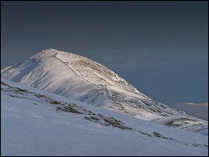 It made a very pleasant view point but was too cold to hang around long. The path continued steeply up to the summit then a very pleasant undulating walk along the ridge to the start of the Whiteless Pike climb. Even though it was cold I was in sun so began to warm up as I started the climb. About half way up the high cloud rolled in and the temperature dropped like a stone. The ground was frozen solid with patches of ice but there were increasing amounts of snow as I climbed and it was in fairly good condition for walking. |