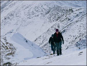 I met another walker coming up. He was wearing crampons and taking no chances as he wasn’t familiar with this part of Cumbria. The climb up to Sand Hill was steep and steady and by now there were plenty of walkers to be seen on the surrounding peaks and ridges. A large party of well equipped walker were coming down as I reached the top and they enjoyed the snow as most slithered down on their back sides. Hopegill Head gave a very impressive view down in to Hobcarton and along the west ridge to Whiteside. |