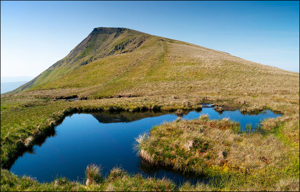 The weather was now quite warm and clouds of annoying flies rose from the grass as I passed. I left the fence at the western end of the fell where there were a succession of tall stone cairns. I followed them NE then across some old quarry workings to the Trig Point. Then I descended Sandtarn Riggs down to the tarn. This is one of those hidden gems. The tarn sits in a slight depression and can only be seen from a small area of the west side of Wild Boar Fell. However, on the bank just above the tarn it is possible to see all around with magnificent views if the weather is clear. |