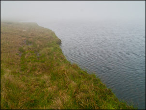 There was no alternative route so I had to stick with it. It was a steady plod with no difficulties. A lone tall cairn ahead told me I was heading in the right direction and as the gradient levelled off I soon saw the waters edge of West Baugh Fell Tarn in front of me. With the restricted visibility I couldn’t see the other side so just followed the shore for a while then headed off to the west to start my descent. |