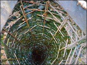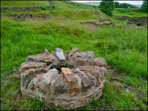 By the road is some new stonework which holds a stone for an information board but its not yet been fitted. A short way up the valley is a vertical mine shaft with a metal grill over the top. It is interesting looking down as the stone circular stonewalls is in excellent condition. |