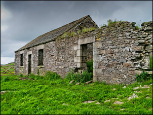 The gully narrowed but soon opened up as I reached higher ground on the approach to the quarry. Before reaching it I turned left on a minor green trail down to the ruin of Showside. The map shows a path continuing to Seldom Seen but there was no sign of it on the ground. It continued across bad ground and I was glad to get to the Seldom Seen building. |